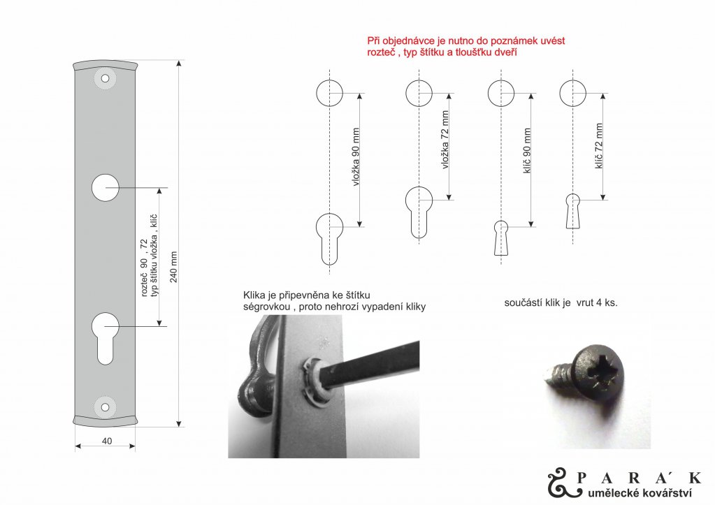 KLIKA MARGO. Povrchová úprava-kovářská grafitová barva. Při objednávce je nutno do poznámek uvést rozteč- 72 mm nebo 90 mm, typ štítku -vložka nebo klíč a tloušťku dveří